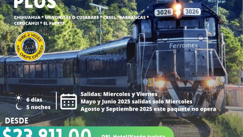 Expresso Tarahumara Plus 6 Días 5 Noches CHIHUAHUA * MENONITAS O CUSARARE * CREEL *BARRANCAS * CEROCAHUI * EL FUERTE Sube 2 Veces al Tren Chepe Express SALIDAS: MIERCOLES Y VIERNES MAYO, JUNIO, AGOSTO Y SEPTIEMBRE 2025 SOLO SALIDAS LOS MIERCOLES DIA 01: CHIHUAHUA (MIÉRCOLES, VIERNES) Llegada al Aeropuerto de la ciudad de Chihuahua. Cuna […]