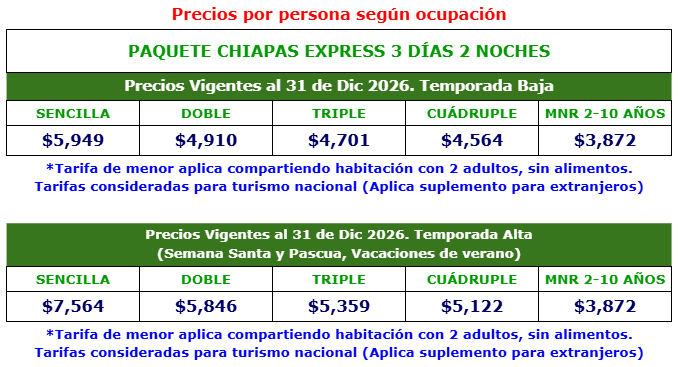 * Niños de 1 año o menos NO podrán abordar la lancha para el Cañón del Sumidero, por disposición de las autoridades.