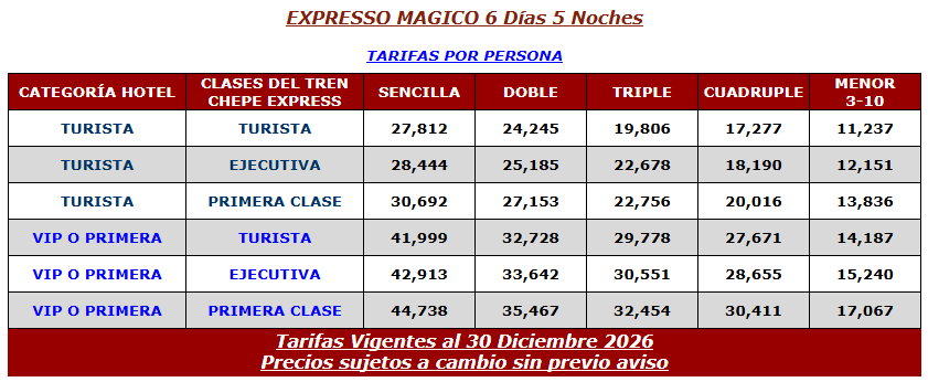 TARIFAS POR PERSONA. VIGENTES AL 31 DE DICIEMBRE 2026. SUJETAS A CAMBIO SIN PREVIO AVISO